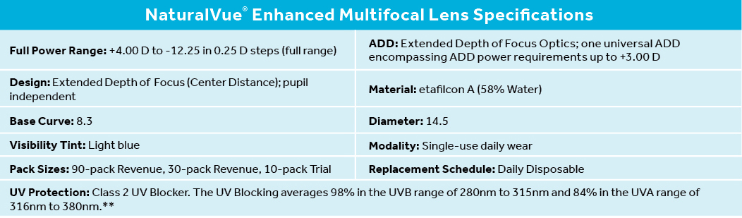 Με τους παραδοσιακούς πολυεστιακούς φακούς επαφής, η μειωμένη όραση και η ξηρότητα μπορεί να αποτελέσουν εμπόδια στην επιτυχή χρήση τους. Για τους πρεσβύωπες, ειδικά για όσους είναι 55+ ετών, η ξηρότητα των φακών επαφής μπορεί να αποτελέσει βάρος. Για τους μυώπες, ο σημαντικός χρόνος που αφιερώνουν στην παρακολούθηση ψηφιακών συσκευών μπορεί να συμβάλει στα συμπτώματα ξηροφθαλμίας. Oι Ημερήσιοι Φακοί Επαφής NaturalVue® Enhanced Multifocal 1 Day™ βοηθούν στην αντιμετώπιση της ενόχλησης από τους φακούς επαφής, προσφέροντας παράλληλα μοναδική οπτική στους ασθενείς, ανεξάρτητα από την ηλικία τους. Με το σύστημα λίπανσης TripleTear™, τρεις παράγοντες άνεσης, συμπεριλαμβανομένου του υαλουρονικού οξέος, συνεργάζονται για να παρέχουν ενυδάτωση και λίπανση, να κλειδώνουν την υγρασία και να διατηρούν μια καθαρή επιφάνεια για τη σταθεροποίηση των δακρύων.